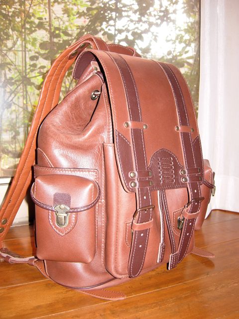 初めて作るリュック型。機能性というよりデザインを重視という方向で作りました。かぶせを大きくすると出し入れし辛いけど外付けポケットのかぶせも兼ねています。 外側に付けている唯一のポケットはハンカチとかどうでもいいものを放り込めるように大きめにしています。 |